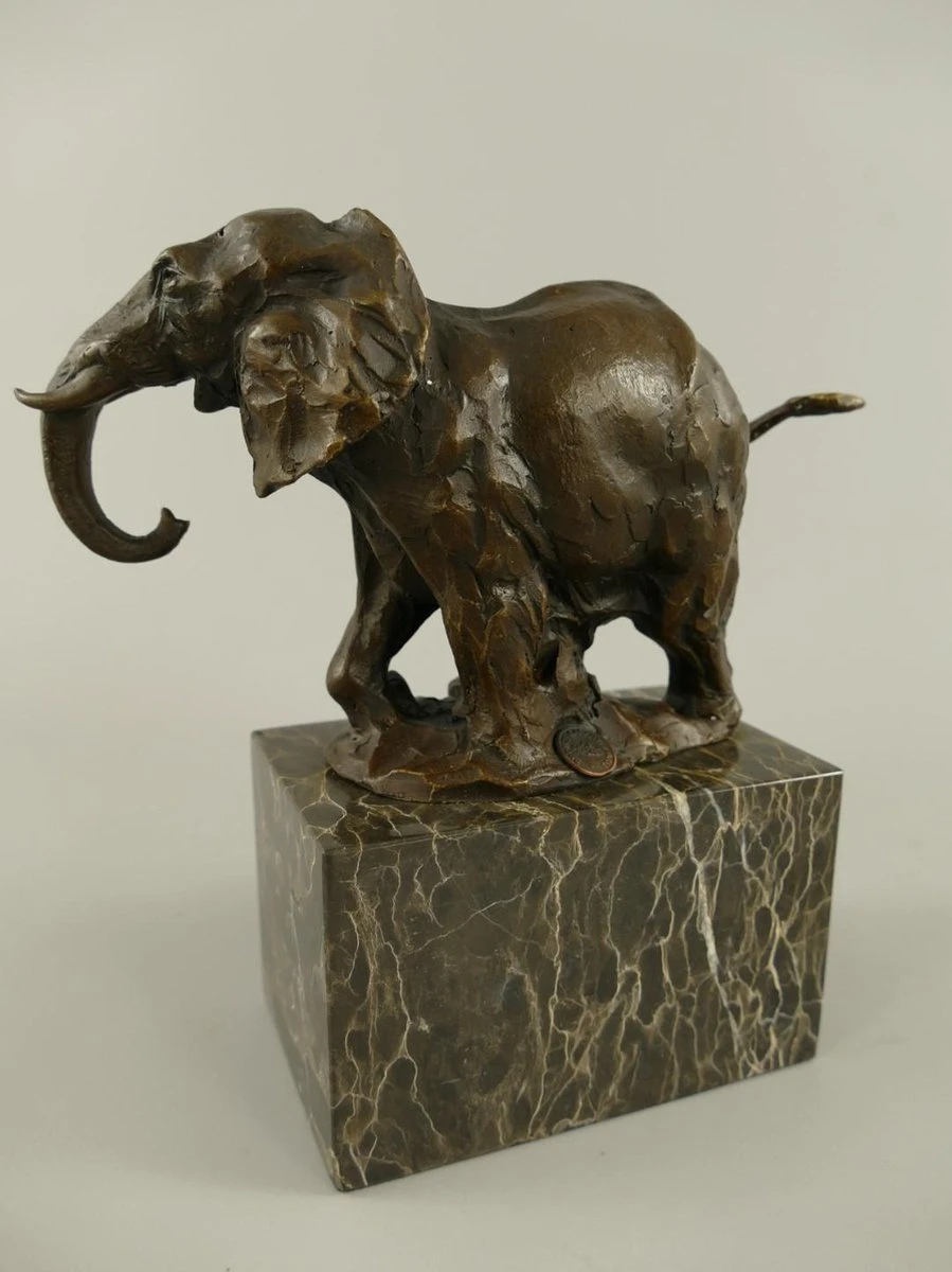 Prachtig gedetailleerd bronzen sculptuur van een olifant, op een sokkel.