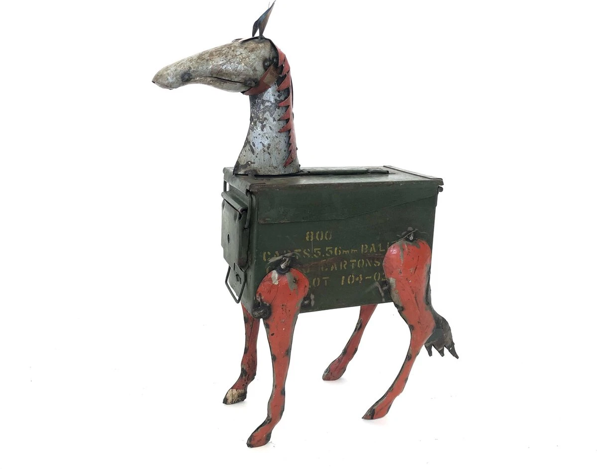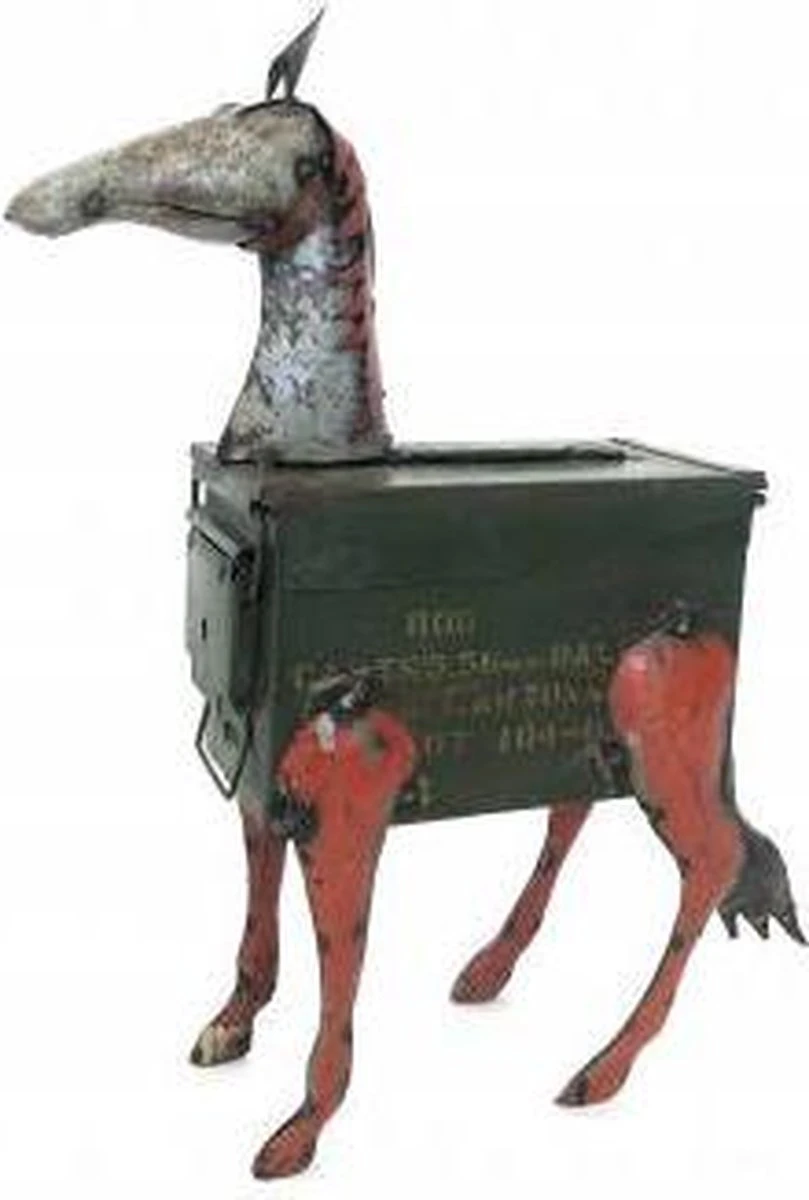 Unieke paard gemaakt van gerecycled ijzer en militaire doos