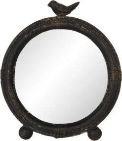 Bruine metalen landelijke ronde spiegel met een vogeltje erop van ons huismerk