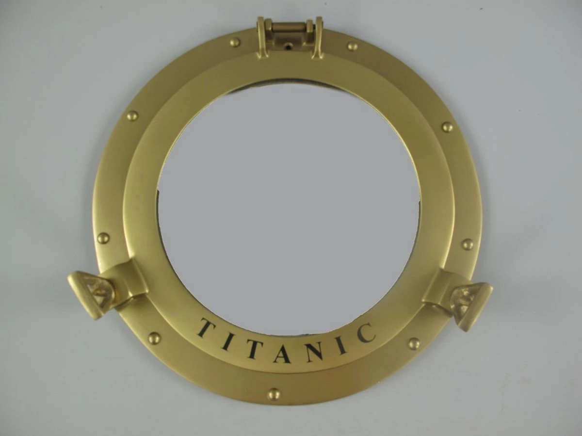 Een leuke spiegels in de vorm van ee partijspoort van de Titanic. Gemaakt van aluminium met een een goude verflaag.