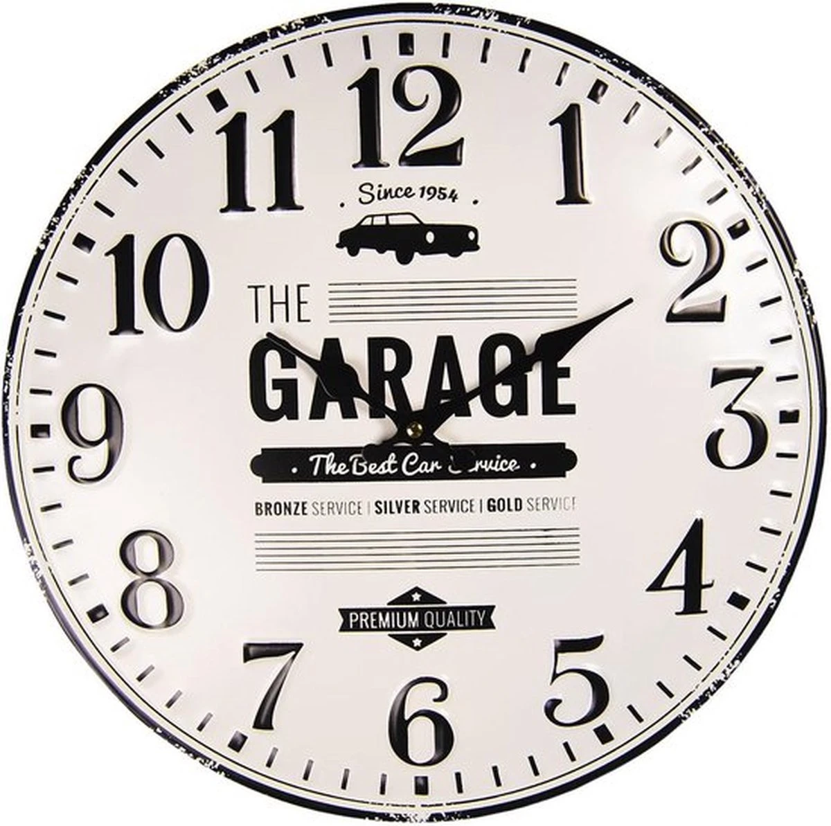 Zwart witte metalen landelijke klok met ‘garage’ op de achtergrond van ons huismerk
