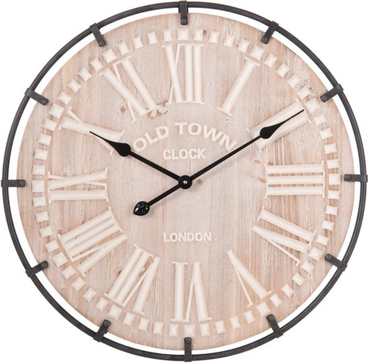 Bruine houten landelijke klok met metalen rand en romeinse cijfers van ons huismerk