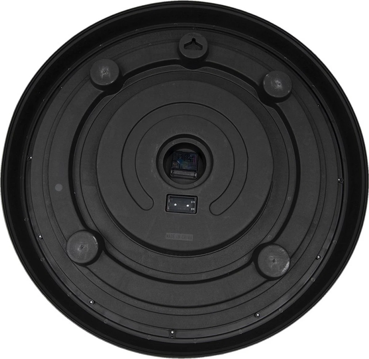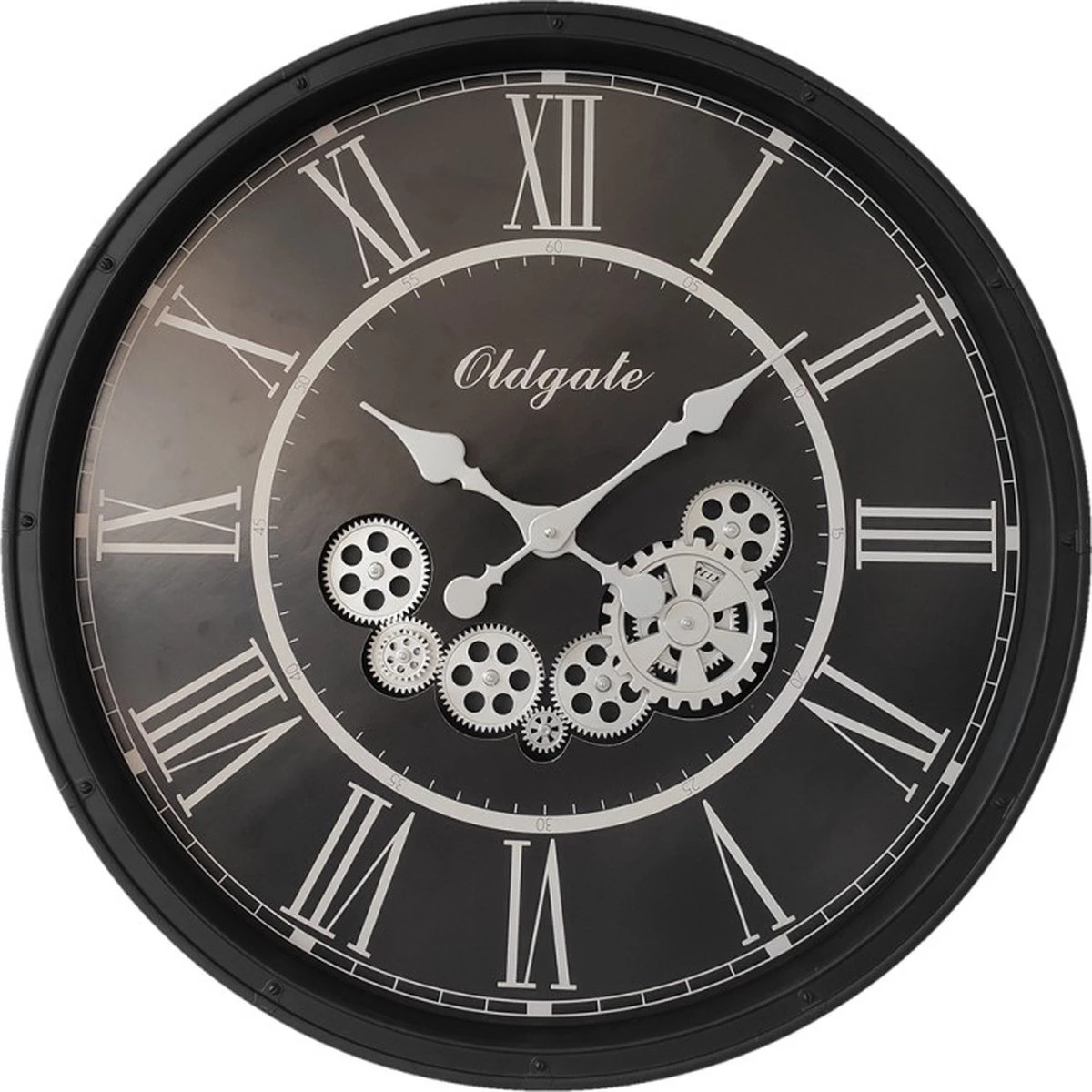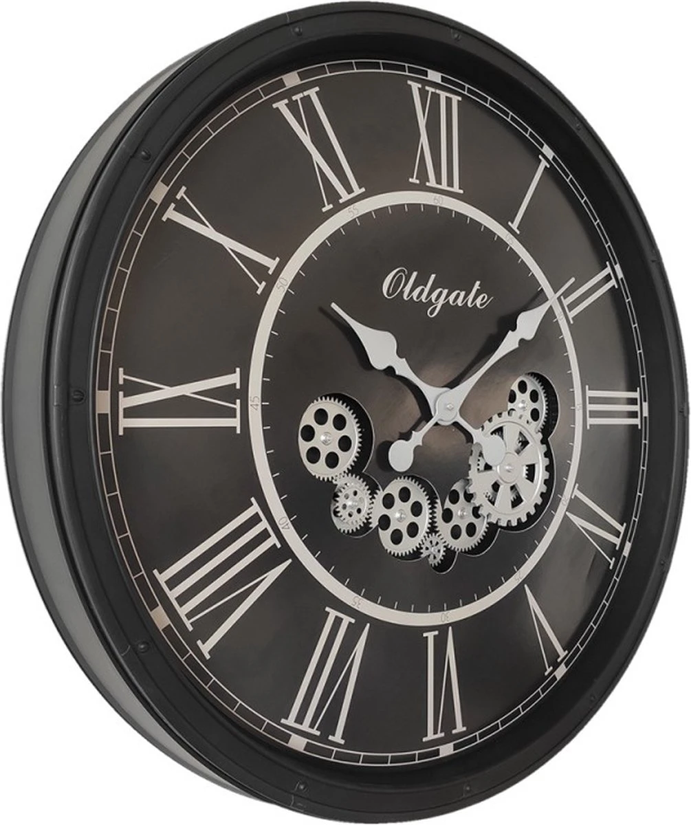 Ronde zwart met witte landelijke klok met romeinse cijfers en zichtbaar en werkend raderwerk van ons huismerk.