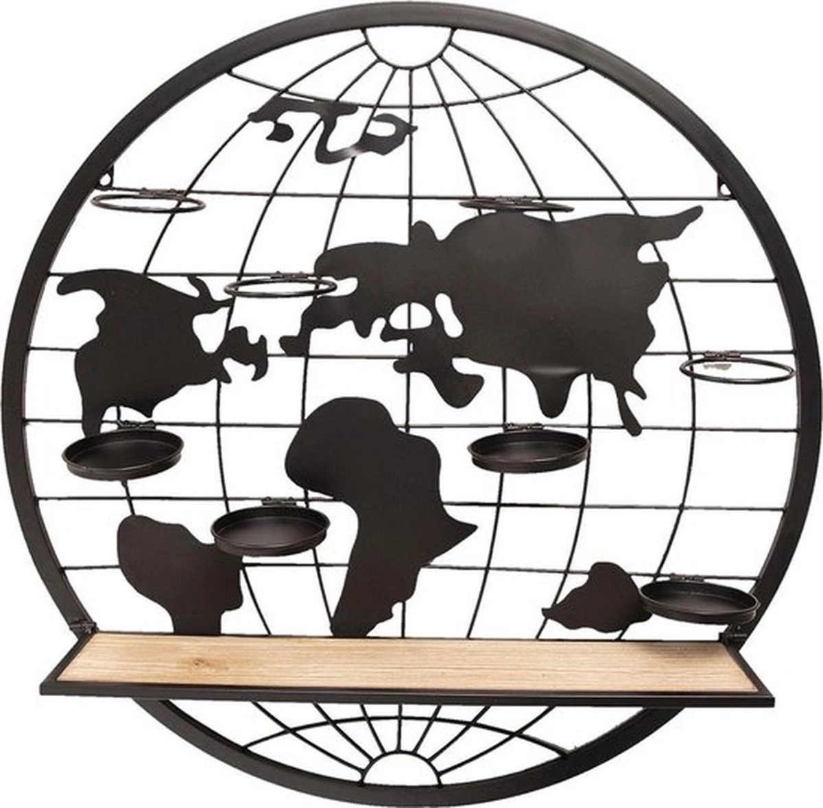 Rond wandrek van zwart metaal in de vorm van de wereldkaart met 1 houten schap en diverse metalen rekjes van ons huismerk in landelijke stijl met industriele uitstraling.