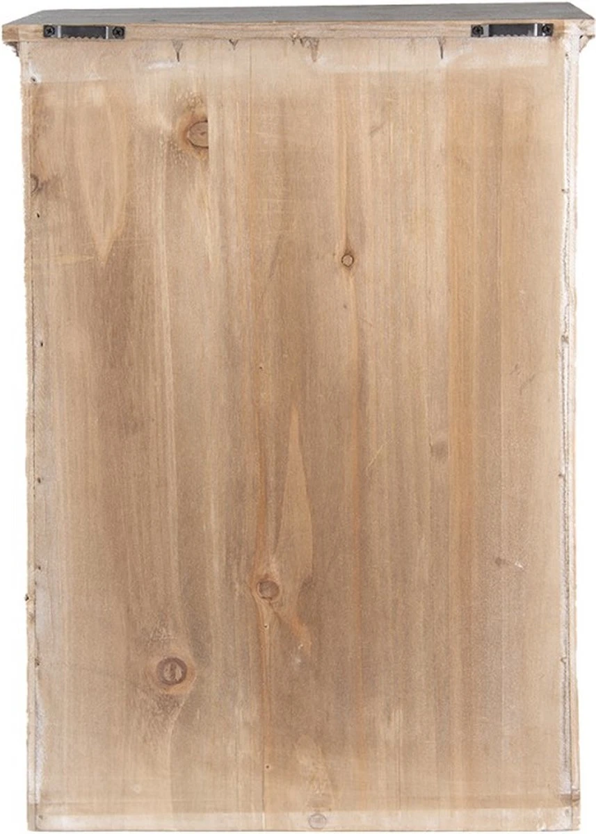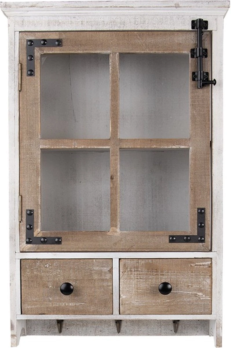 Landelijk wit met bruin houten wandkastje met een deurtje 32×36 cm, twee laatjes 13x11x8 cm, een schapje en aan de onderkant drie haakjes, van ons huismerk. Muurrek Opbergkast