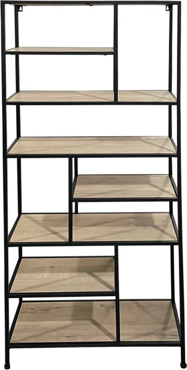 Industrieel staand zwart rek met ongelijke bruine schappen hoogte 153 cm van ons huismerk