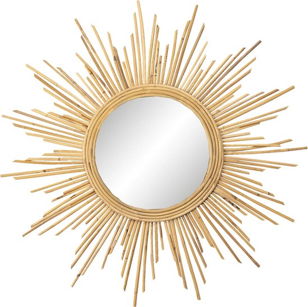 Goudkleurige retro rotan spiegel van ons huismerk. Spiegel afmetingen: Ø30 cm